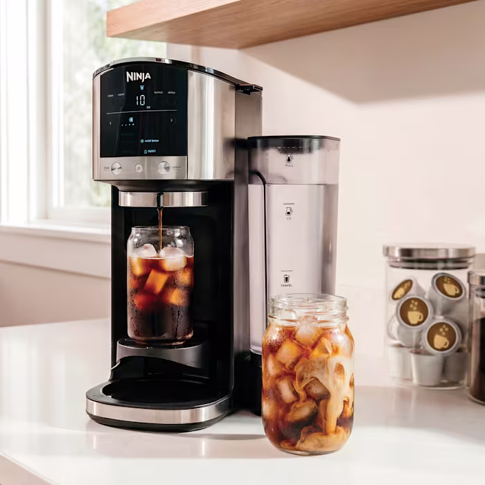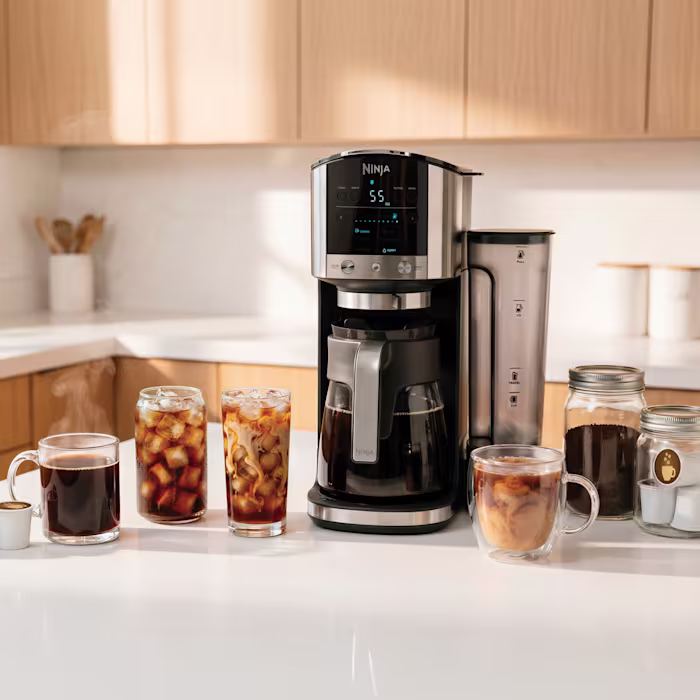 Brews with either ground coffee or pods for ultimate flexibility. Multiple cup sizes from a single cup to a full carafe. Custom brew strengths for classic, rich, or over‑ice coffee.
